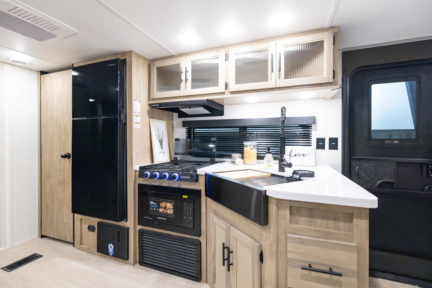 • Blackout Glass, Safety Slam, Friction Hinge Entry Door with Window and Shade Prep (N/A on LP models)
