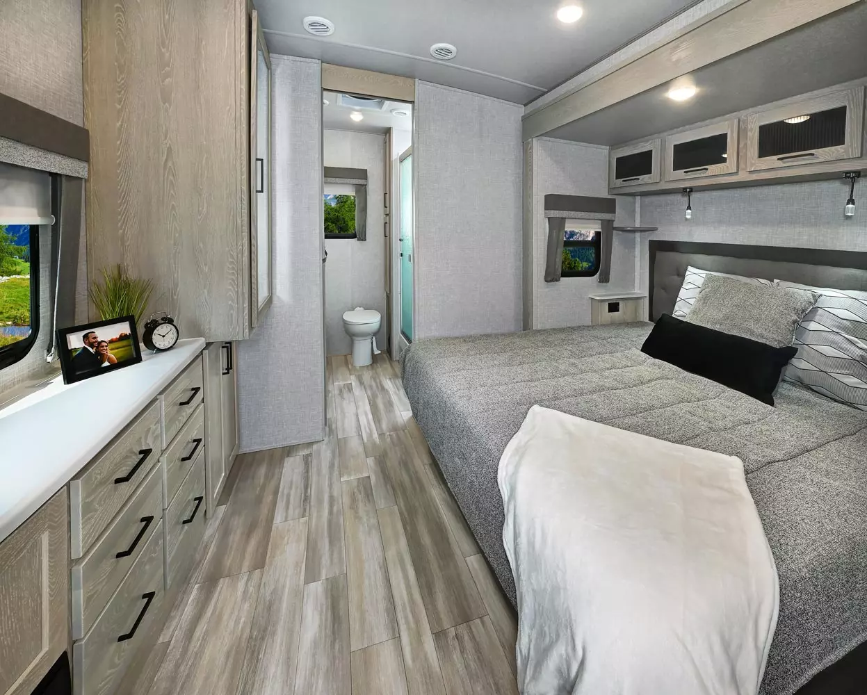 EXQUISITE, EXPANSIVE INTERIORS AS THE NORM. WELCOME TO THE CLASSIC SERIES, REDEFINING THE CAMPING EXPERIENCE THROUGH AN ARRAY OF REMARKABLE FEATURES. With its inviting open floorplans and ample storage capacity, there's room for those cherished guests or family you wish to bring along. As you nestle into the embrace of a plush king or queen sized bed, the restlessness of your adventures fade away. Through its efficient layout and panoramic windows, the classic travel trailers offer you an opportunity to luxuriate in your surroundings, all while enjoying the comfort of your serene interior.